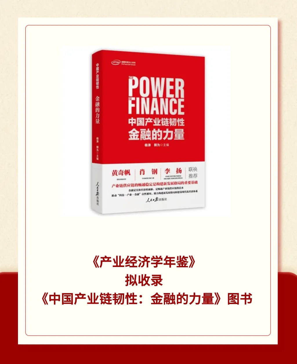 近日,经《产业经济学年鉴》编撰委员会推荐,该年鉴拟收录由国家金融与发展实验室副主任杨涛、BB贝博艾弗森官网董事长郭为主编的《中国产业链韧性:金融的力量》。该年鉴编撰工作依托中国社会科学院工业经济研究所、中国工业经济学会。